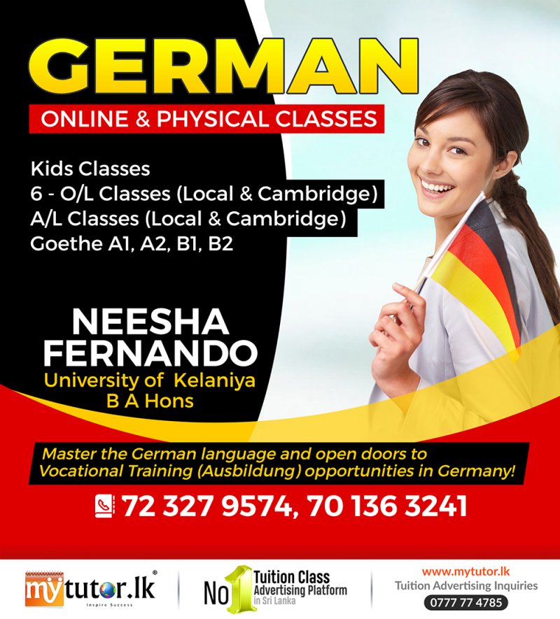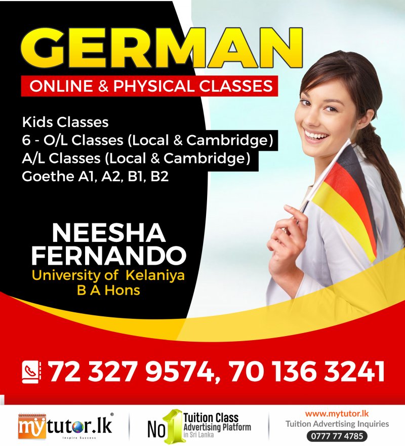 German Courses for Beginners * German Courses for Goetha exams ( A1,A2 & B1 ) * German Basic Courses * online German Courses * German for Cambridge IGCSE & EDEXEL Exams * German Advanced Level Classes * Ordinary level classes. German Classes are conducted by me since 6 years.I do the classes in colombo area. I use simple & Successful methods to explain the Grammar lessons. I do many listening papers and also i teach how to speak german..i currently working in a leading international school in colombo.and i am a graduate teacher at university of kelaniye ( B.A.Hons ). Contact for more details; 0705597057 / 0723279574