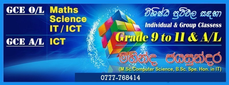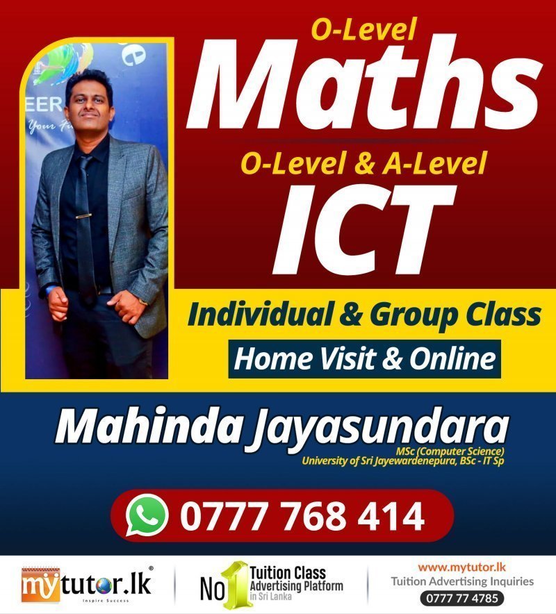 GCE A/L (ICT) - Information Communication Technology, Information Technology GCE O/L(ICT and Maths) Cambridge Computer Science AS & A Level Cambridge International AS & A Level Computer Science Classes from Grade 9 to 13 2 hours per visit. Class fee will depend on the grade. Well qualified teacher with 10 years of experience in the industry. This is the best time to start your theory and revisions classes to achieve the best result. I will help you to get the best result by guiding you. Zoom/Home visit classes for individuals and small groups. Local syllabus. ගණිතය 9 වසර සිට 11 වසර දක්වා.. නිවසට පැමිණ ඉගැන්විම. කණ්ඩායම් පන්ති අවශ්ය පරිදි සකසා ගත හැක දුර්වල සිසුන් සදහා සුවිශේශී ක්රම ඔස්සේ ඉගැන්විම . ව්ශය නිර්දේශය මුල සිට සරලව.