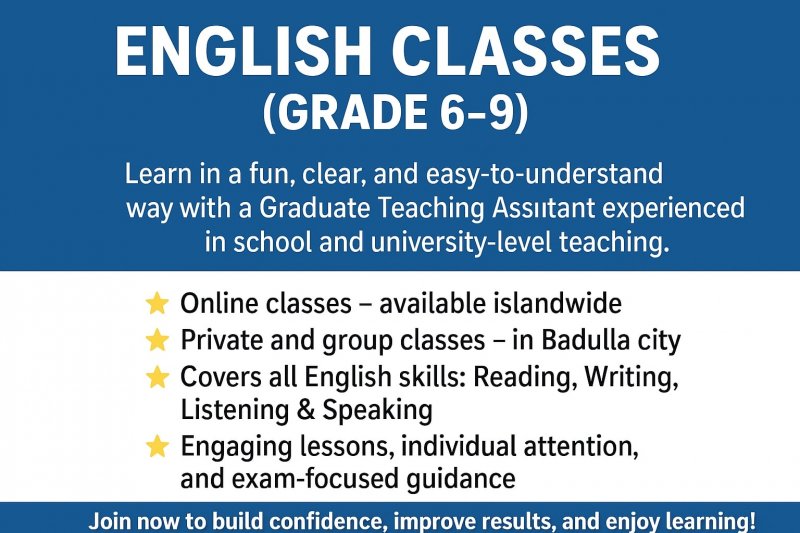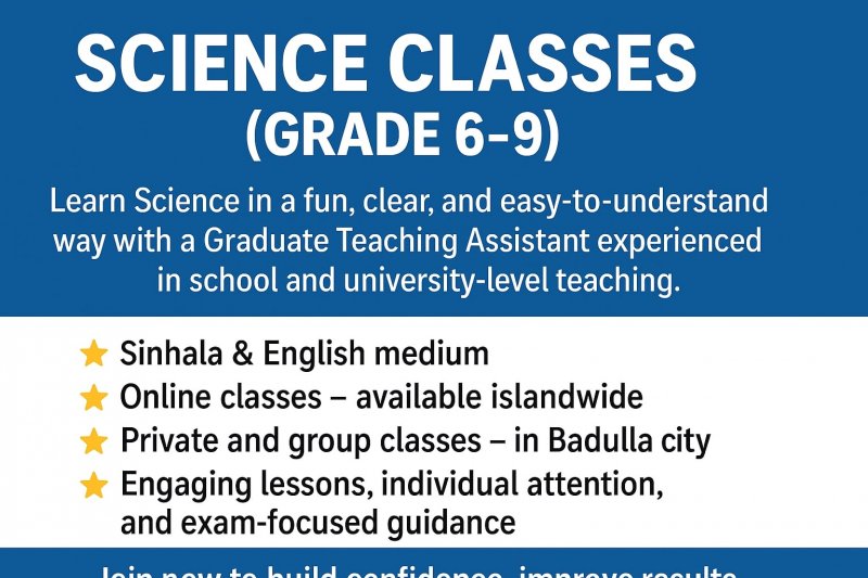 Science & English Classes (Grade 6–9) Learn Science and English in a fun, clear, and easy-to-understand way with a Graduate Teaching Assistant experienced in school and university-level teaching. ✨ Sinhala & English medium ✨ Online classes – available islandwide ✨ Private and group classes – in Badulla city ✨ Covers all English skills: Reading, Writing, Listening & Speaking ✨ Engaging lessons, individual attention, and exam-focused guidance Join now to build confidence, improve results, and enjoy learning!