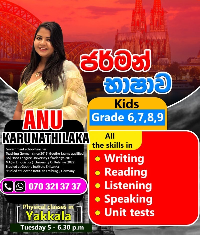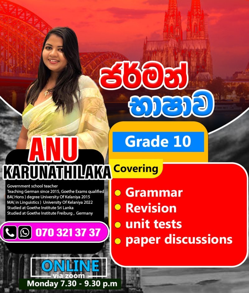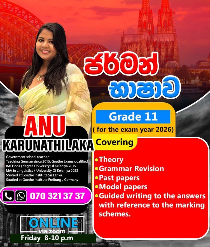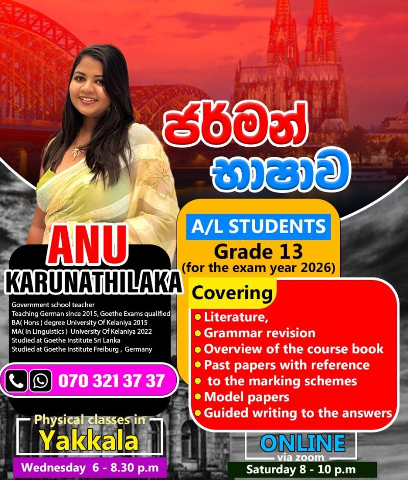 Experienced government school teacher with over 9 years of teaching experience since 2015, achieving top-ranked results in Sri Lanka's Advanced Level examinations. Holds a Goethe Certificate B2 and has completed a language course at the Goethe Institute in Freiburg, Germany. Actively participates in teacher training seminars and exams conducted by the Goethe Institute of Sri Lanka. Offers individual and group classes for the 2026 A/L exams, available both online and in-person (physical classes held in Yakkala, Gampaha).