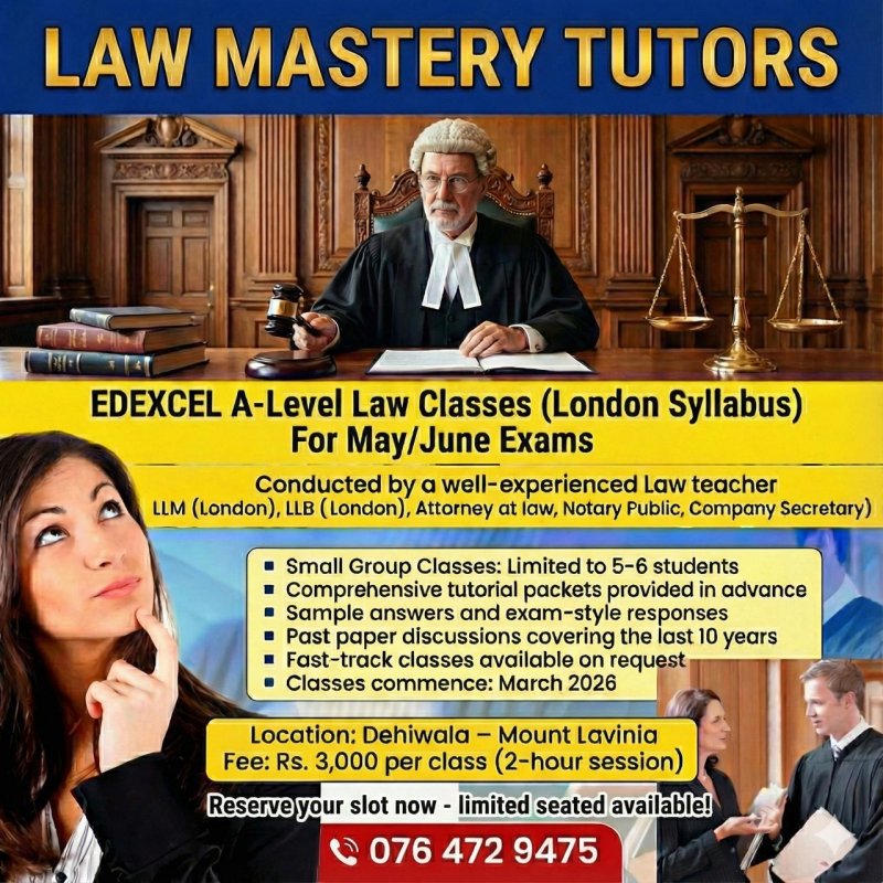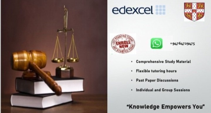 Edexcel A Level law classes and conducted by a well experienced law teacher with LLB ( University of London) LLM (University of West London) Attorney at law, Company Secretary, Notary public Awarded for outstanding performance for the year 2015 Small group classes Physical classes Provides comprehensive tutes prior to class Sample answers provided Ten years of past papers covered Enroll now to reserve time slots.