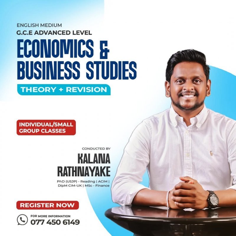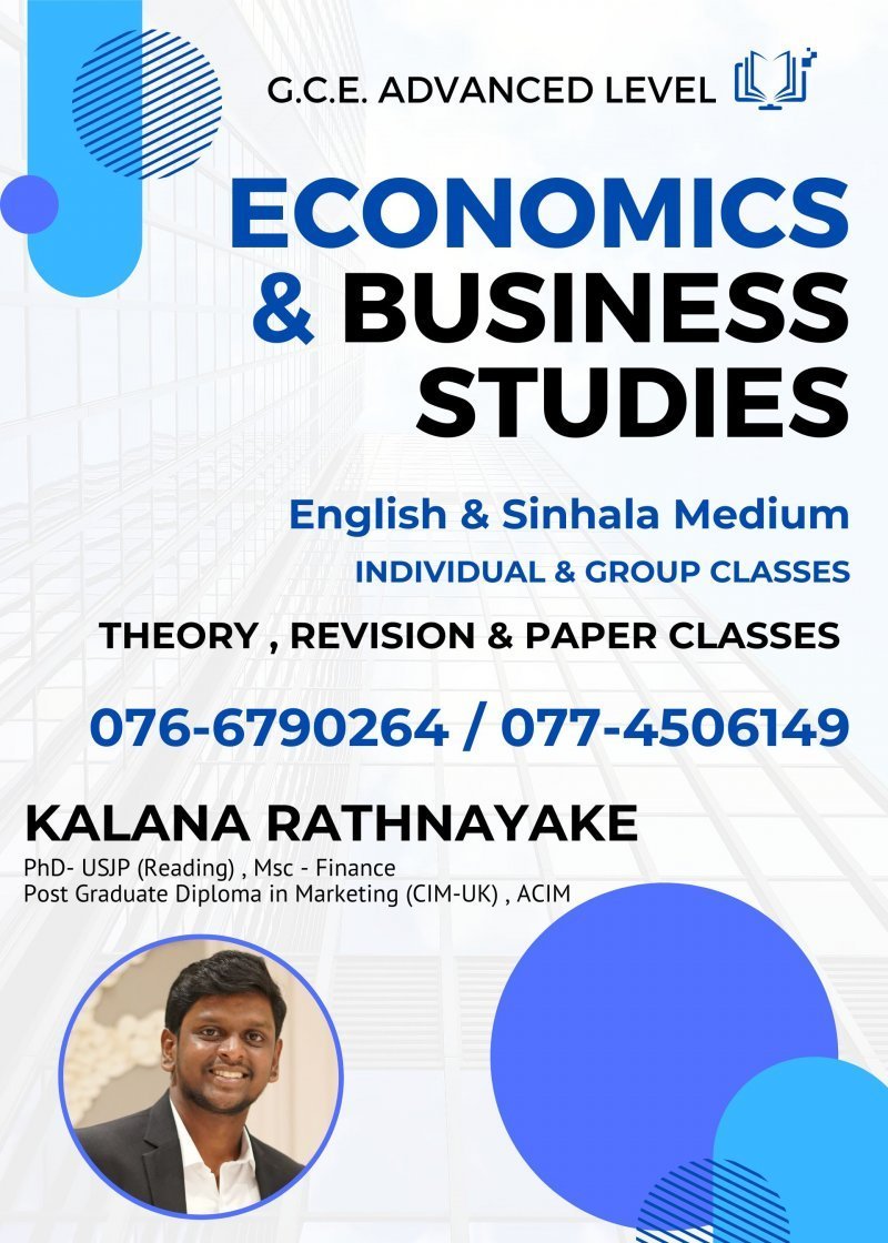 Economics & Business Studies Classes for: Levels : G.C.E Advanced Level (both English and Sinhala Medium) Cambridge (Ordinary Level and Advanced Level) Conducted By: Kalana Rathnayake (PhD - Reading [PIM-USJP] ,DipM CIM UK, ACIM, Msc Finance) with over 8 years of teaching experience.