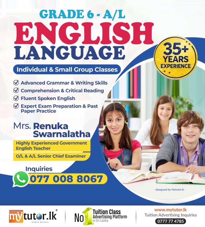 Retired Government School English Teacher with over 35 years of distinguished service, conducting English classes for Grades 6–11, G.C.E. O/L, and A/L General English (Local Syllabus). Former Panel Chief Examiner for O/L and A/L paper marking, with thorough knowledge of national marking schemes, examiner expectations, and answer structuring techniques. Classes are conducted in Sinhala and English Medium. Available for Individual and Small Group sessions in the Gampaha District. Focused training includes: • Advanced Grammar & Writing Skills • Comprehension & Critical Reading • Spoken English Development • Structured Exam Preparation & Past Paper Practice Limited intake to maintain quality and personal attention.
