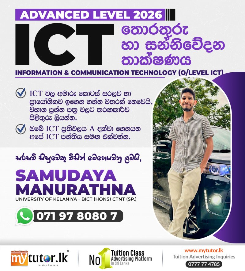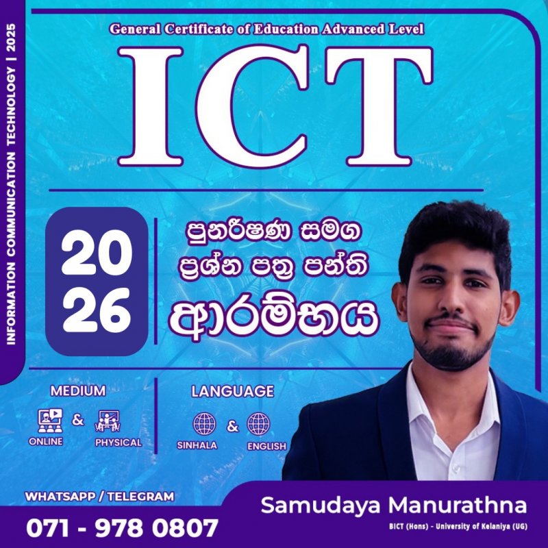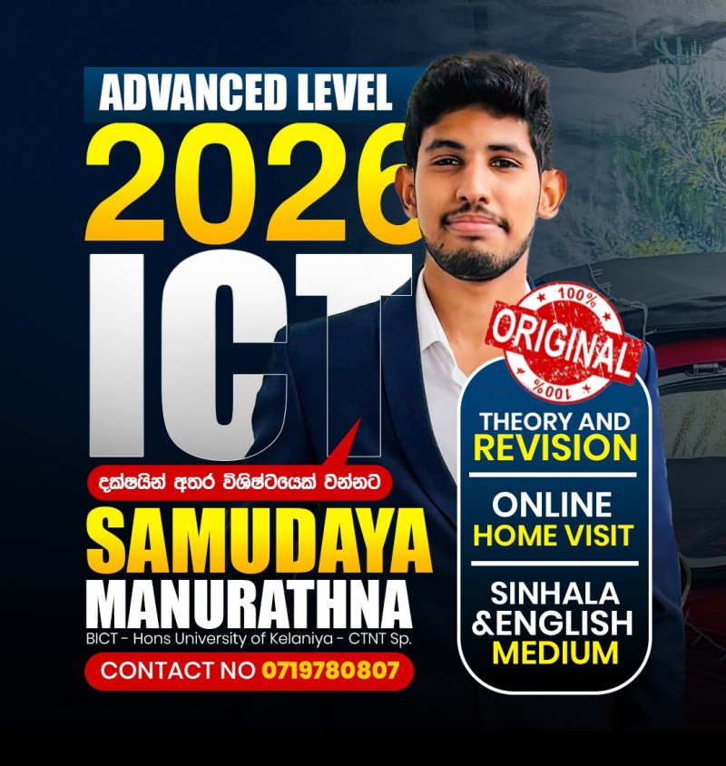 ඔබේ සොදුරු සරසවි සිහිනයට යන මාවතේ...... මගහැරිය නොහැකි ICT A සිහිනයට ... අපෙන් අත්වැලක්... අ.පො.ස උසස් පෙළ තොරතුරු සහ සන්නිවේදන තාක්ෂණය.... Advance Level Information and Communication Technology.. 2025 A/L සදහා පුනරීක්ෂණ පන්ති ආරම්භය ...... 0719780807 අංකයට ඔබේ නම සහ උසස් පෙළ වර්ෂය සමගින් කෙටි පණිවිඩයක් යොමු කර දැන්ම ලියාපදිංචි වන්න... # A සිහිනය, සිහිනයක් නොවන්නට..... #EICT #Alevel #ICT #පන්ති #උසස්පෙළ #bridebridge