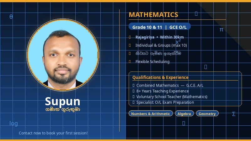 10 හා 11 ශ්රේණි (O/L) ගණිතය ඉගැන්වීම සඳහා කැපවූ ටියුෂන් ගුරුවරයෙකි. උසස් පෙළ සඳහා Combined Mathematics අධ්යයනය කර ඇති බැවින් ගණිත සංකල්ප සරලව පැහැදිලි කිරීමට හැකියාව ඇත. මීට පෙර පාසලක ස්වේච්ඡා ගුරුවරයෙකු ලෙස ගණිතය ඉගැන්වූ අත්දැකීම මට ඇත. Past papers, model questions සහ exam techniques භාවිතා කරමින් සිසුන්ගේ ලකුණු මට්ටම වැඩි කර ගැනීමට විශේෂ අවධානය යොමු කරමි. Individual හෝ කුඩා කණ්ඩායම් (සිසුන් 10 දක්වා) සඳහා පන්ති පැවැත්විය හැක. Rajagiriya, Battaramulla, Nugegoda, Kotte සහ අවට ප්රදේශ සඳහා නිවසට පැමිණ ඉගැන්වීම සිදු කරමි. විස්තර සඳහා අදම සම්බන්ධ වන්න. 071-1554382