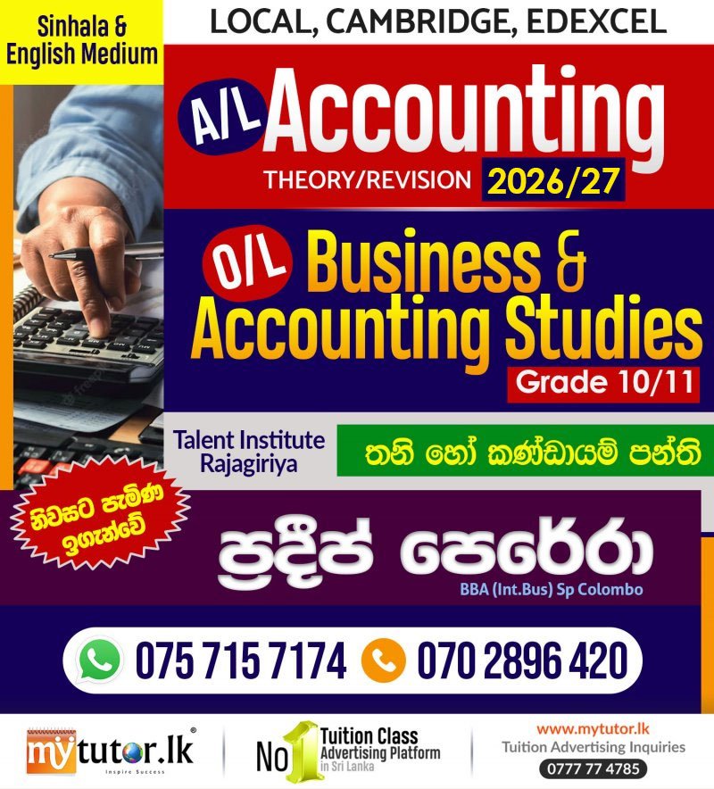 Classes will be conducted for dedicated students and will ensure maximum preparation for the examination. Thus students are guided for higher results. A complete set of tutorials will be provided for the entire syllabus and the syllabus will be covered before 2 months to the exam. Students will be fully prepared for the exam by doing past papers during the last 2, 3 months. // Classes Available - // 2026/27 A/L - Theory + Past papers in last 2 months // 2028 A/L - Theory + Continuous assessment + Past papers in last 3 months // 2026/2027 O/L - Theory + Continuous assessment + Past papers (Call for more details) // Contact - 0757157174 / 0702896420 // Home visited - All the cities in Colombo and Kalutara Districts.