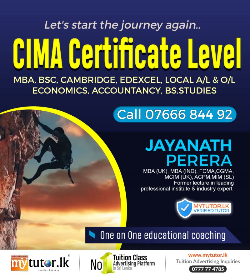 One-on-One Educational Coaching – CIMA Certificate Level & Beyond // Let’s start the journey again! // Offering individualized coaching for: CIMA Certificate Level // MBA, BSc, Cambridge, Edexcel, Local A/L & O/L // Economics, Accountancy, Business Studies // Lectures conducted in English or Sinhala medium with free extra hours for student discussions & clarifications. // Lecturer: Jayanath Perera // MBA (UK), MBA (India), FCMA (UK), ACMA (SL), MCMI (UK) // Former lecturer in leading professional institutes | Industry expert with corporate sector experience in Sri Lanka, Maldives & Qatar // Call / WhatsApp: 07666 84492 // Reserve your time today and take the next step in your academic journey!