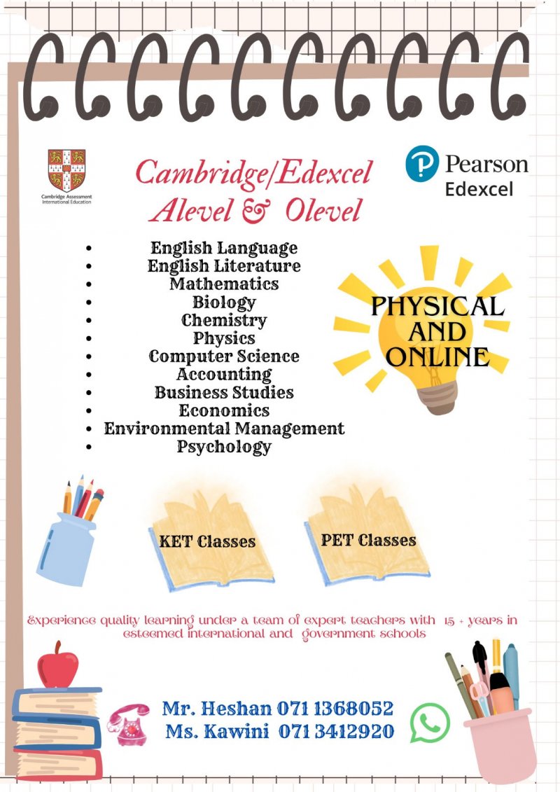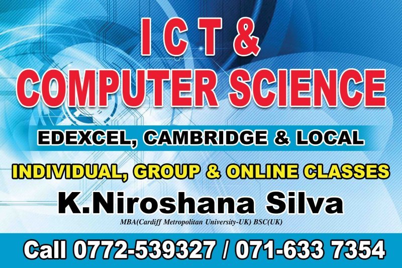 ICT Online Classes for Grade 6–13 Local School Syllabus, Cambridge. A/L & O/L Revision and Computer Programming Classes for Kids (Group Classes - English & Sinhala Medium with Theory & Practical-සිංහල /ඉංග්රීසි මාධ්ය කණ්ඩායම් පන්ති) A laptop or a Desktop is preferred for students. Conducted By K. Niroshana Silva BCS (UK - British Computer Society), MBA (UK - Cardiff Metropolitan University) Lecturer, Consultant with 30 years of ICT Industry Experience.