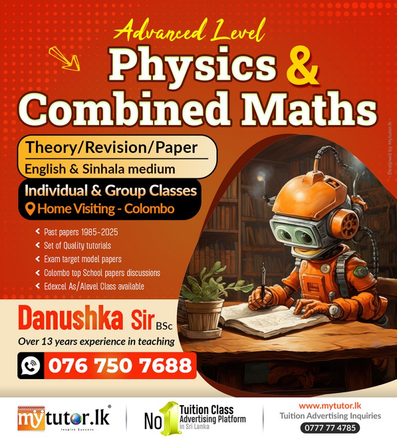 Al Physics & Combined Maths- Theory /Revision /Paper classes. Classes are conducted by an experienced expert tutor with over 12 years experience in teaching. Class are done in both English medium and Sinhala medium . Individual and Small Group classes available. Classes are conducted in colombo district. ( Home visiting ) Fully Theory covered with well explanation. Set of Quality tutorials with new questions available for each and every lesson. Past paper discussions from Al 1985-2023 . Special Exam target model papers discussions. Colombo school term test papers discussions. All physics practicals are discussed with structure essay questions. Best guidance for Combined Maths & Physics. වසර 12 ක පලපුරුදු විශිෂ්ඨ ප්රතිඵල බිහිකල ගුරුමහතෙකි.