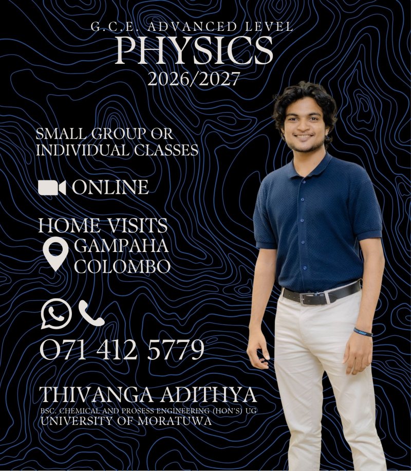 භෞතික විද්යාව තනි හෝ කුඩා කණ්ඩායම් පන්ති සඳහා විමසන්න. වසර 3ක පලපුරුද්ද සහිත මොරටුව විශ්ව විද්යාලයේ ඉන්ජිනේරු සිසුවෙක් විසින් මෙහෙයවයි.Online හෝ Physical පන්ති කරනු ලැබේ. සරල මට්ටමේ සිට සංකීර්ණ මට්ටම දක්වා විෂය කරුණු අවබෝධ කර දෙනු ලැබේ. කුමන මට්ටමක සිසුවෙක් වුවද නිවැරදි මඟපෙන්වීමක් ලබා දෙනු ලැබේ. විභාගය ආසන්න වන විට ප්රශ්න පත්ර කරවීම මඟින් මනා පුහුණුවක් ලබාදෙයි. විෂයන් 3ම කලමණාකර ගැනීමට උපදෙස් ලබාදෙයි. 2026 Revision/Theory, 2026 Theory, Paper Classes විමසන්න 0714125779 Whatsapp 0714128779