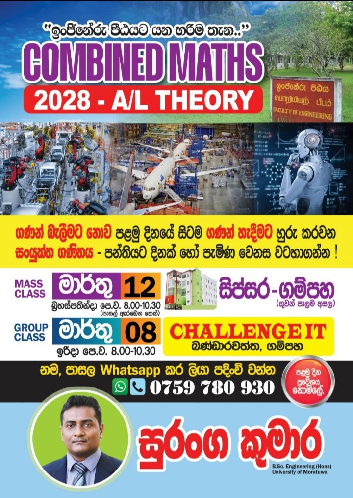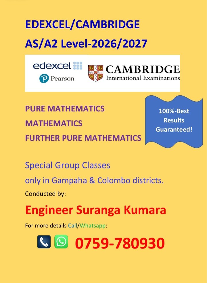 උසස් පෙළ සංයුක්ත ගණිතය G.C.E.Advanced Level Combined Maths 2028-Theory 2027 -Theory /Revision 2026-Theory/Revision/Papers සිංහල/English Medium 100%-හොඳම ප්රතිඵලවලට වගකියන *Special Group Classes* -ගම්පහ සහ කොළඹ දිස්ත්රික්කයන්හි පමණි. දේශක සහ මෙහෙයවීම *ඉංජිනේරු සුරංග කුමාර* වැඩිවිස්තර 0759780930 ඇමතීමෙන් හෝ Whatsapp කිරීමෙන් ලබාගන්න. London syllabus Edexcel/Cambridge AS/A2 Level-2026/2027 PURE MATHEMATICS MATHEMATICS FURTHER PURE MATHEMATICS *Special Group Classes* only in *Gampaha & Colombo districts.* 100%-Best Results Guaranteed ! Conducted by *Engineer Suranga Kumara* For more details *Call/Whatsapp 0759-780930*