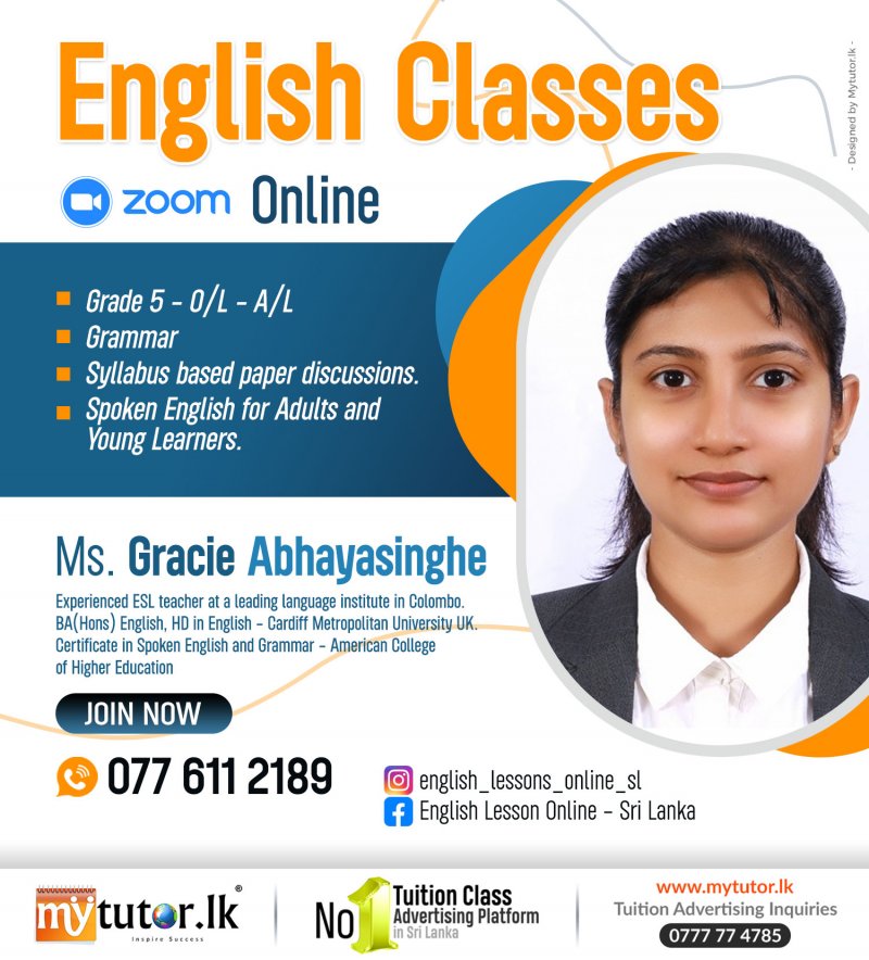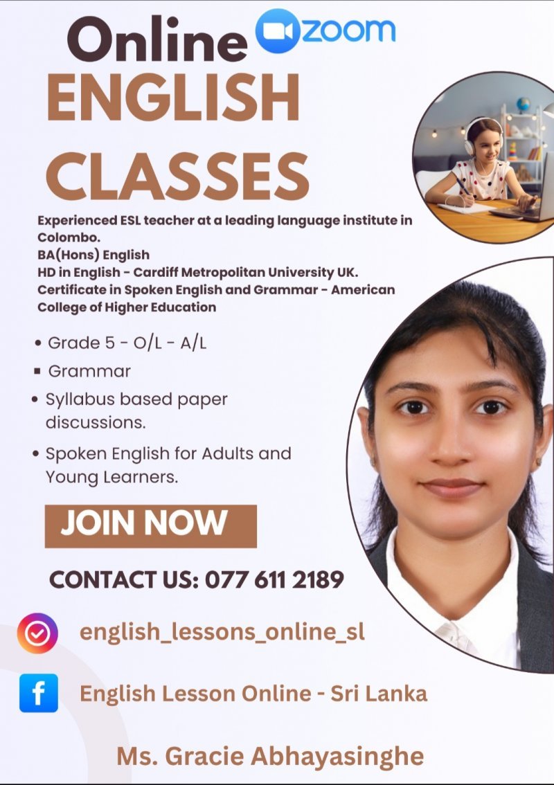 Learn English with Confidence! Spoken English & Grammar classes for young learners and adults – from Grade 5 to O/L and A/L. Interactive lessons, paper discussions, and exam support through individual or group Zoom sessions.